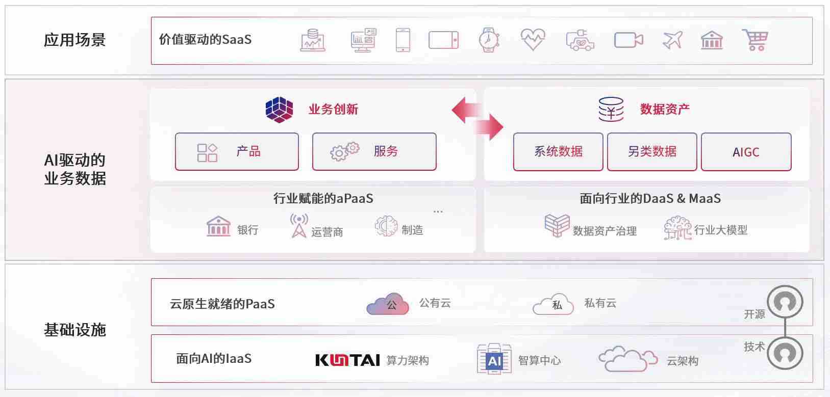 数字时代,,,围绕企业数字化转型的关键要素,,2939威尼斯数码开创性的提出数云融合战略和技术体系框架,,着力在云原生、、数字原生、、、AI原生和信创产业上架构产品和服务能力,,,,为处在不同数字化转型阶段的快消零售、、、、汽车、、、、金融、、、医疗、、政企、、教育、、运营商等行业客户提供泛在的敏捷IT能力和融合的数据驱动能力,,,构建跨界融合创新的数字业务场景和新业务模式,,助力企业级客户建立面向未来的核心能力和竞争优势,,全面推动社会的数字化、、、智能化转型升级。。