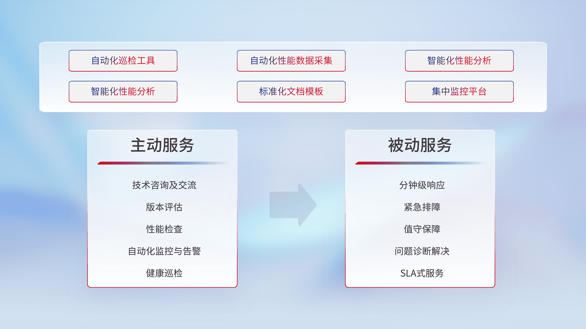 智能化工具和标准化文档,,,保障服务质量,,,,提供主动服务(包含技术咨询、、、版本评估、、、、性能检查、、、、自动化监控与告警、、、、健康巡检)和被动服务包含(分钟级响应、、紧急排障、、、值守保障、、、、问题诊断解决、、SLA服务)。。。